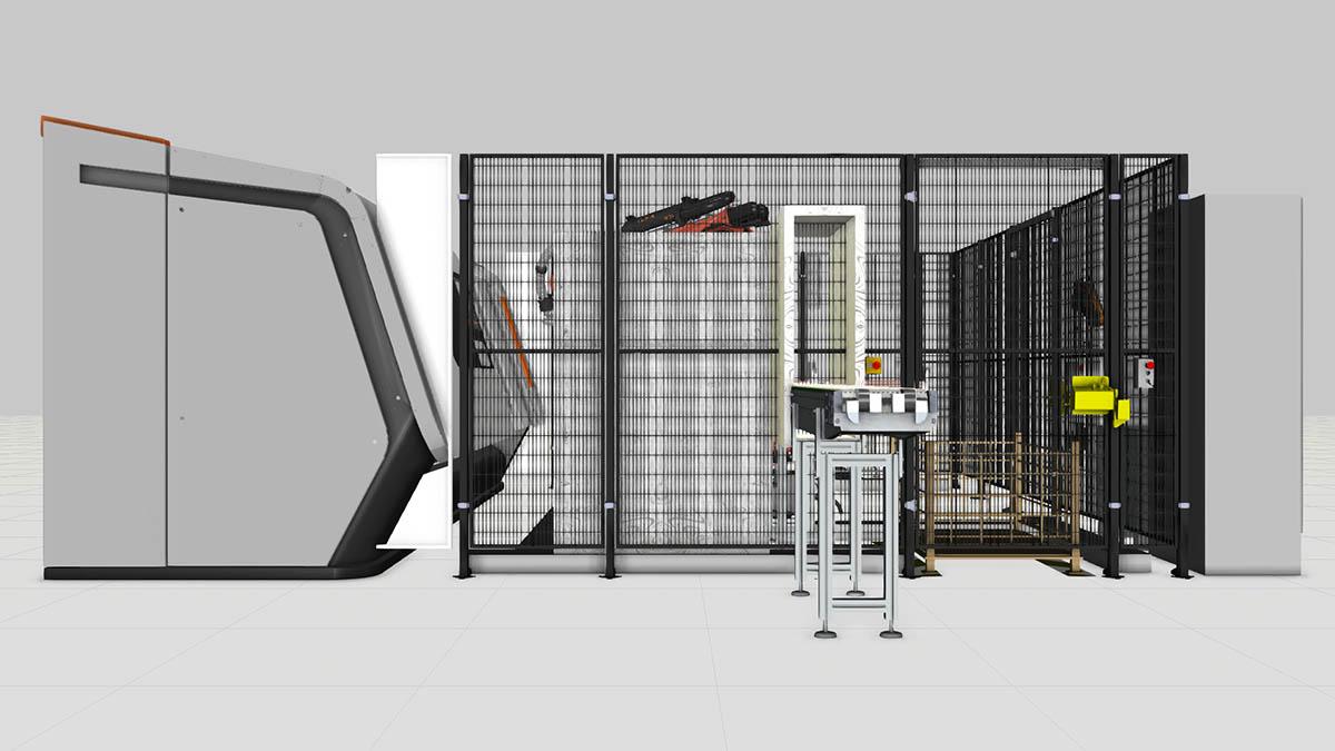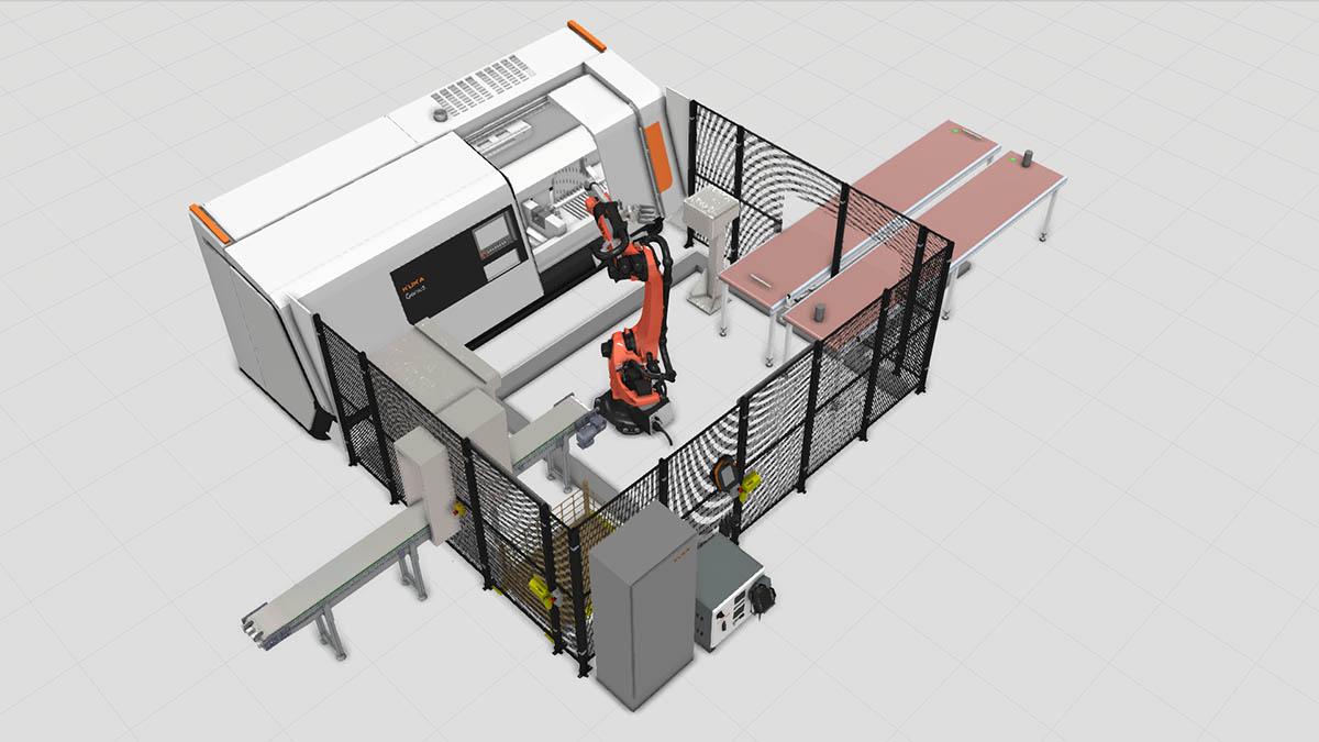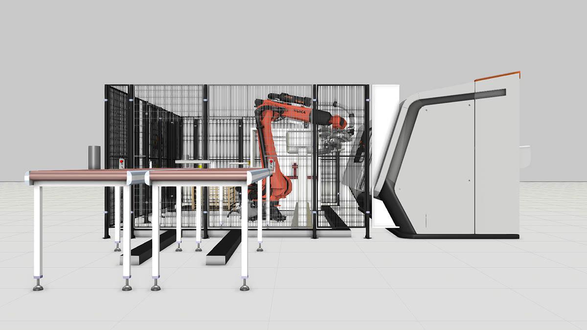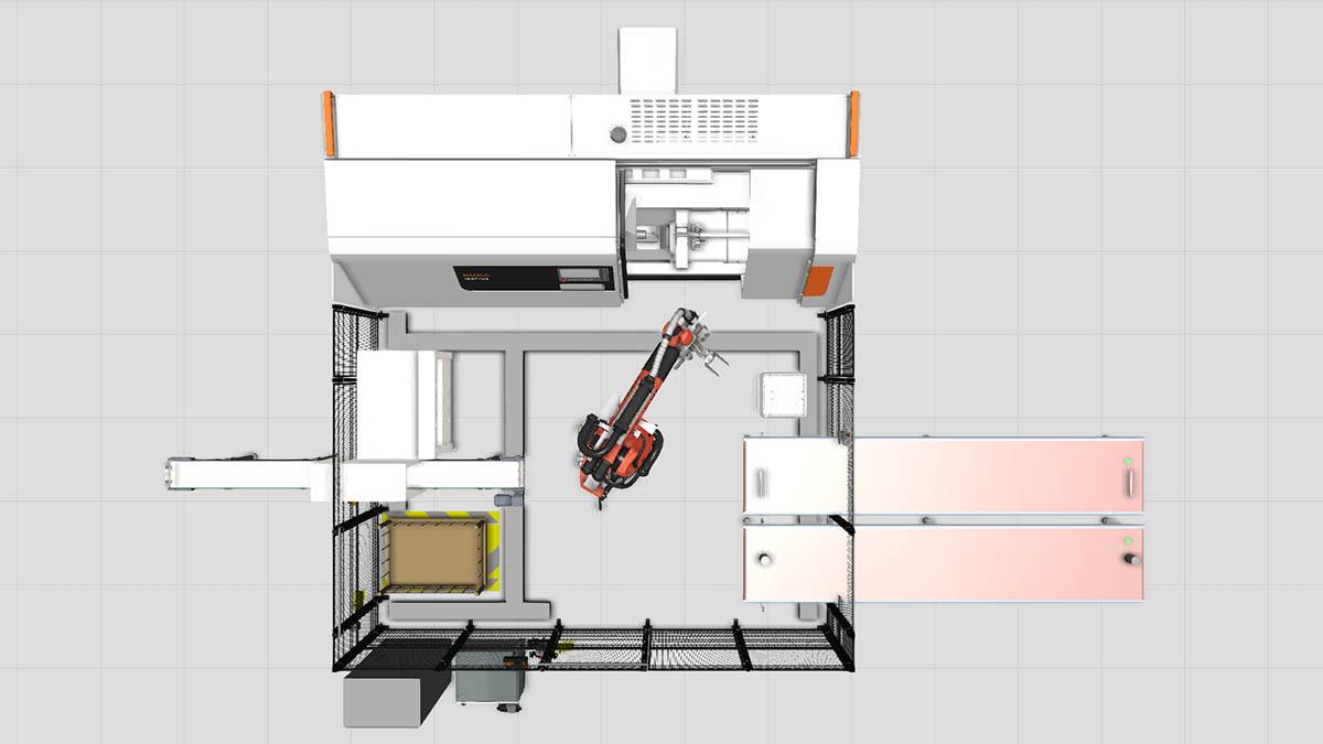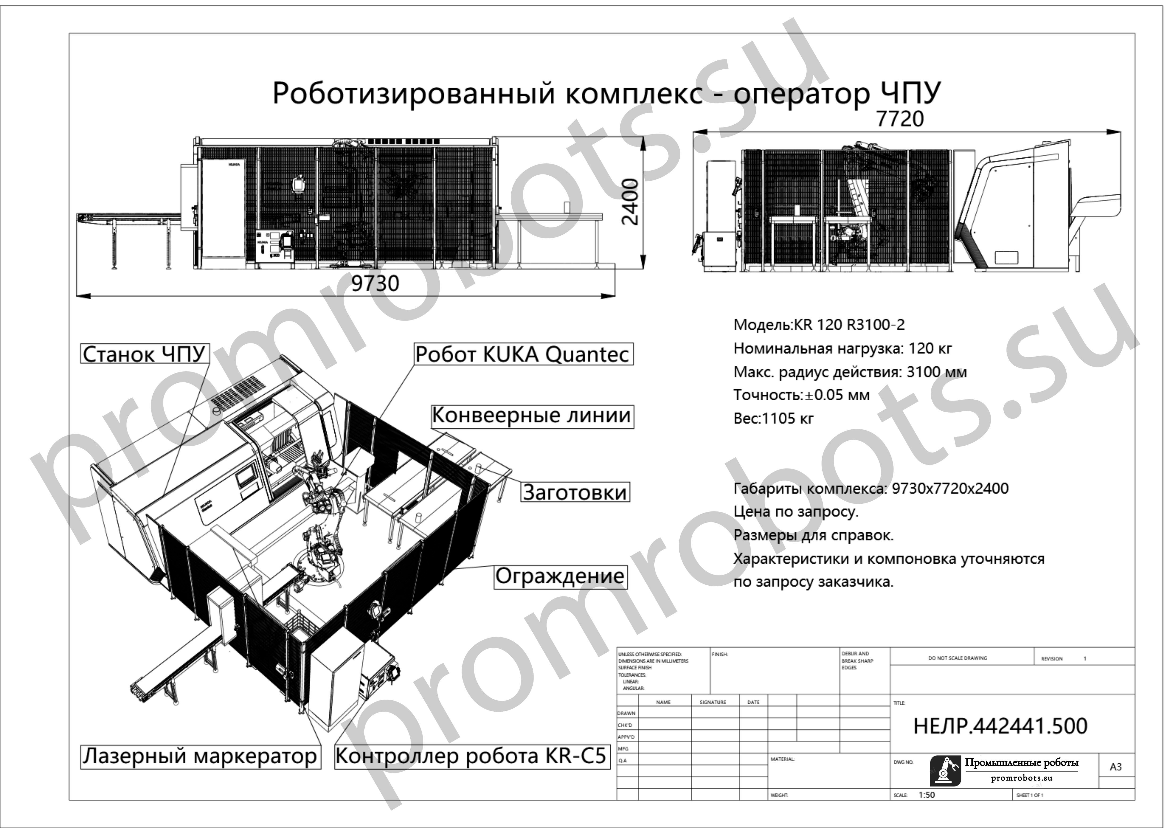 Назначение Комплекс автоматизирует подачу заготовок и выгрузку готовых деталей из токарных и фрезерных станков с ЧПУ. Решение повышает производительность, сокращает простои оборудования и снижает влияние человеческого фактора. Принцип работы Робот KUKA QuanTec берёт заготовки с входного конвейера или паллеты, подаёт их в рабочую зону станка ЧПУ и фиксирует в патроне/приспособлении. После завершения обработки робот снимает деталь, подносит в зону лазерной маркировки, маркирует и укладывает её на выходной конвейер или в тару. Такая организация обеспечивает непрерывный цикл работы станка. Ключевые преимущества: - Рост производительности: станок работает без остановок на ручную загрузку; - Гибкость: возможность работать с деталями разного размера и формы; - Качество и стабильность: исключение ошибок оператора при загрузке/выгрузке; - Безопасность: робот работает в ограждённой зоне, оператор участвует только в обслуживании паллет; - Интеграция: комплекс подключается к системе управления станком. Состав комплекса: - Робот KUKA KR 120 R3100-2 (серия QuanTec); - Станок ЧПУ (модель по выбору заказчика или имеющийся станок); - Входные и выходные конвейеры для заготовок и деталей; - Система ориентации заготовок; - Защитное ограждение и система безопасности; - Контроллер KUKA KR C5; - Лазерный маркер для идентификации деталей (опция). Технические параметры: - Номинальная нагрузка робота: 120 кг; - Рабочий радиус: 3100 мм; - Точность позиционирования: ±0,05 мм; - Габариты комплекса: 9730 × 7720 × 2400 мм; - Вес робота: 1105 кг. Опции и расширения: - Автосмена захватов для работы с разными деталями; - Камера машинного зрения для ориентирования заготовок; - Система укладки деталей на паллеты/кассеты; - Дополнительные конвейеры и накопители; - ПО: СПРУТКАМ. Варианты исполнения: - Базовый: робот + интерфейс со станком; - Расширенный: добавлены конвейеры и ограждение; - Под ключ: полный комплекс с интеграцией, пусконаладкой и обучением.