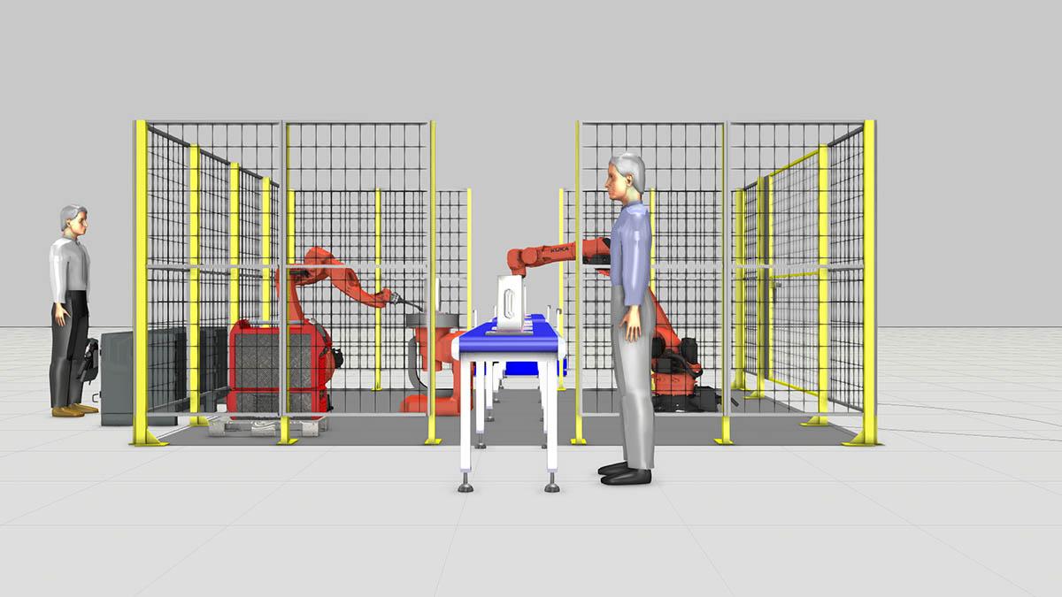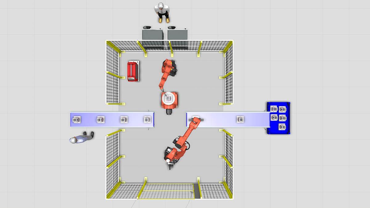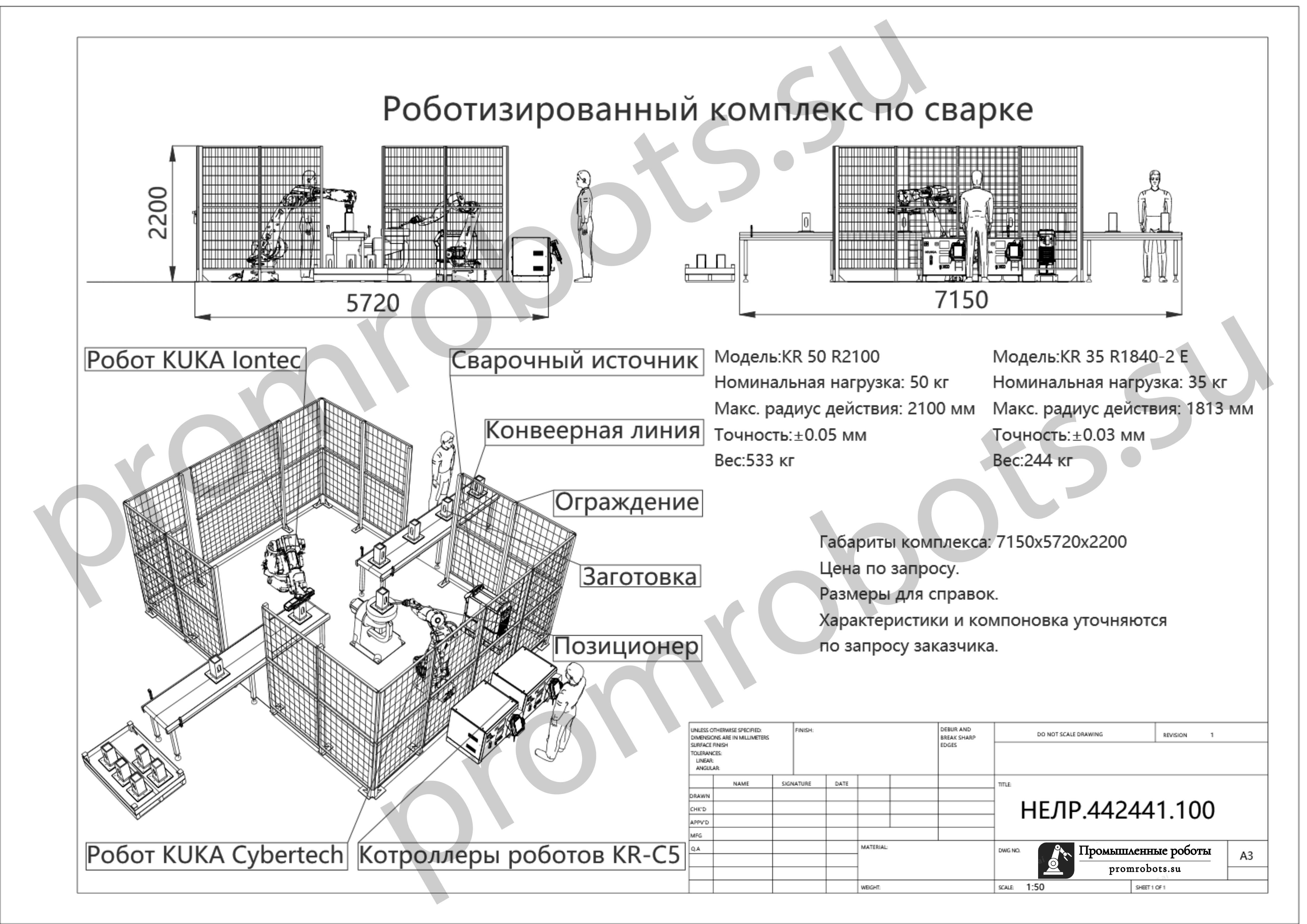 Назначение Комплекс предназначен для автоматизации сварки серийных деталей и полностью заменяет ручные операции подачи и сварки. Система построена на базе промышленных роботов KUKA и обеспечивает стабильное качество, высокую производительность и безопасность работы персонала. Принцип работы Комплекс реализует схему с двумя роботами: - Робот-манипулятор берёт заготовку с конвейера и устанавливает её в позиционер; - Робот-сварщик выполняет полный цикл сварки на закреплённой детали. После завершения операции робот-манипулятор снимает готовое изделие и укладывает его на выходной конвейер, одновременно подавая новую заготовку. Благодаря этому достигается непрерывный цикл производства и минимизация простоев. Ключевые преимущества: - Высокая производительность: за счёт разделения функций между двумя роботами сварка и подача происходят параллельно; - Стабильное качество: точность до ±0,03 мм гарантирует повторяемость швов. - Гибкость конфигурации: возможность адаптации под разные типоразмеры и изделия; - Снижение издержек: автоматизация вспомогательных операций разгружает персонал и сокращает время цикла; - Интеграция в линии: комплекс легко встраивается в существующие производственные процессы. Состав комплекса: - Робот KUKA KR 50 R2100 (робот-манипулятор); - Робот KUKA KR 35 R1400 E (сварка); - Сварочный источник MIG/MAG; - Позиционер для точного закрепления деталей; - Конвейерная линия подачи и вывода заготовок; - Защитное ограждение; - Контроллеры KUKA KR-C5. Технические параметры: - Грузоподъёмность роботов: 50 и 35 кг; - Радиус действия: 2100 и 1813 мм; - Точность: ±0,05 мм и ±0,03 мм; - Габариты комплекса: 7150 × 5720 × 2200 мм. Опции и расширения: - Станция обслуживания горелки, датчик столкновения; - Системы трекинга шва: дуговой (TAST), камерный и триангуляционные датчики; - Автоматическая смена инструментов и быстросменные захваты; - Дополнительные позиционеры, конвейеры и оснастка; - Лазерные сканеры и световые завесы для безопасности; - ПО: СПРУТКАМ.
