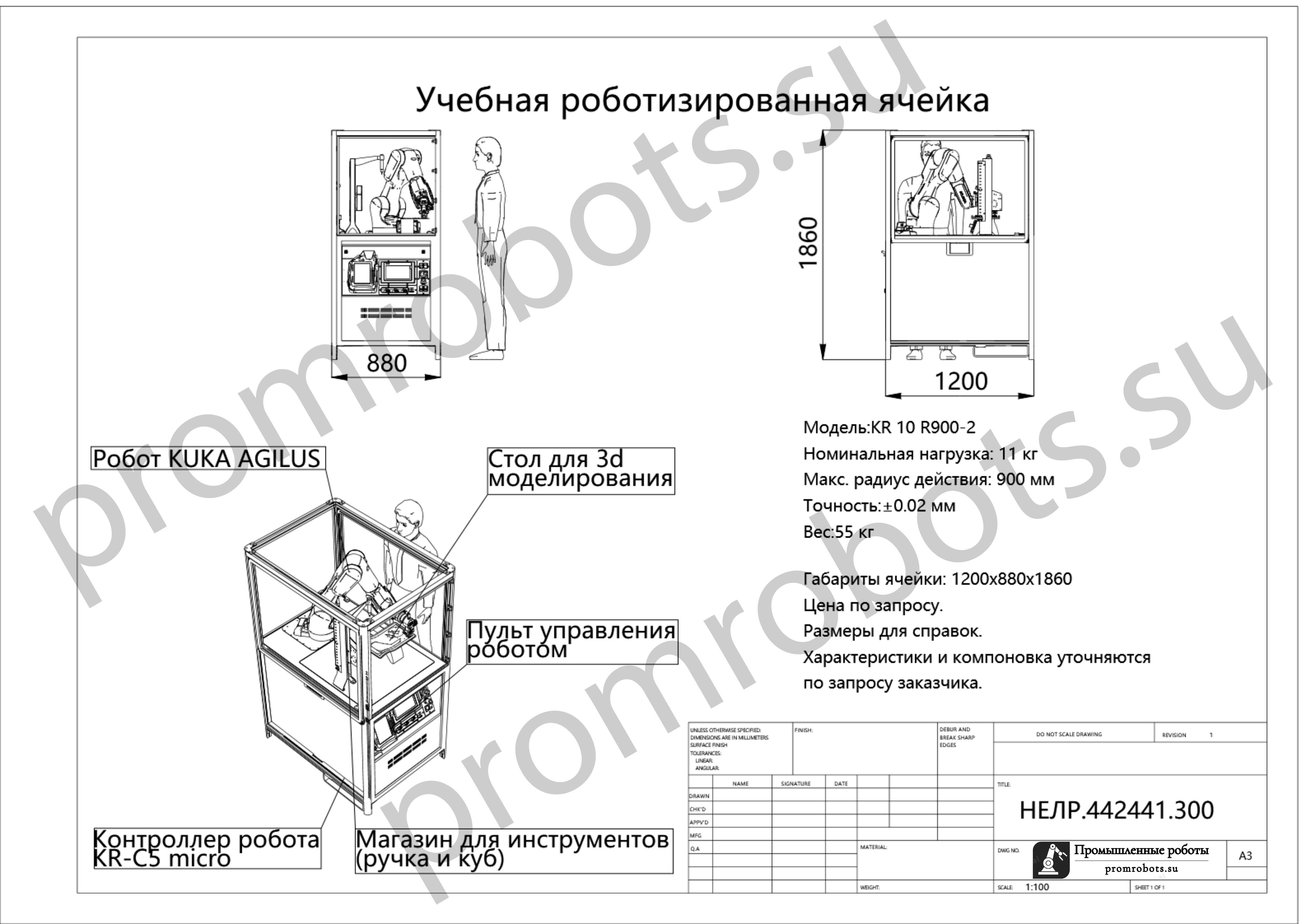 Назначение Учебная ячейка создана для подготовки студентов, инженеров и операторов в области промышленной робототехники. Она позволяет отрабатывать навыки программирования, управления движениями робота, работы с различными инструментами и интеграции периферийного оборудования. Принцип работы В защищённом компактном корпусе установлен промышленный робот KUKA Agilus с контроллером KRC5 micro. На учебном столе расположены модели для выполнения заданий: манипуляции с объектами, сборка, простые технологические операции. Система поддерживает программирование через пульт SmartPad и моделирование в ПО KUKA.Sim. Ключевые преимущества: - Компактность — установка в лаборатории или учебном классе; - Безопасность — защитная клетка и аварийные системы; - Универсальность — поддержка разных инструментов и сценариев обучения. - Совместимость с современным ПО KUKA; - Практическая ценность — навыки работы полностью соответствуют промышленным условиям. Состав комплекса: - Робот KUKA Agilus KR 10 R900-2; - Контроллер KUKA KRC5 micro; - Пульт SmartPad; - Учебный стол для 3D-моделирования; - Магазин для инструментов ; - Захват; - Корпус ячейки. Технические параметры: - Грузоподъёмность: 11 кг; - Радиус действия: 900 мм; - Точность: ±0,02 мм; - Вес робота: 55 кг; - Габариты ячейки: 1200 × 880 × 1880 мм; - Питание: 220 В, 50 Гц. Опции и расширения: - Дополнительные инструменты (вакуумный захват); - Камера машинного зрения. Варианты исполнения: - Базовый: робот, корпус ячейки, контроллер, SmartPad; - Расширенный: дополнительно учебный стол и магазин инструментов; - Под ключ: полный комплект с периферией, ПО, установкой и обучением.