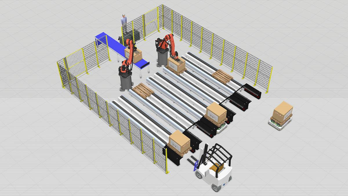 Назначение Комплекс автоматизирует процессы складирования, паллетизации и внутрискладской логистики. Решение снижает ручной труд, ускоряет обработку грузов и обеспечивает полную интеграцию с логистическими системами предприятия. Принцип работы Роботы KUKA QuanTec берут коробки или заготовки с конвейера и укладывают их на европаллеты по заданной схеме. Готовые паллеты передаются на паллетную станцию, откуда их забирает автономный мобильный робот (KUKA AMR) и доставляет в зону хранения или к линии отгрузки. Процесс полностью автоматизирован и исключает простой оборудования. Ключевые преимущества - Высокая производительность: работа в непрерывном режиме 24/7. - Гибкость: укладка продукции разных размеров и конфигураций. - Снижение затрат: автоматизация тяжёлых операций и исключение ошибок оператора. - Интеграция: подключение к WMS/ERP для управления складом. - Безопасность: ограждения и интеллектуальные системы навигации AMR. Состав комплекса - Роботы KUKA KR 140 R3200-2 (QuanTec, 2 шт.) - Автономный мобильный робот KUKA AMR (до 1,5 т) - Паллетная станция - Конвейерные линии - Зона укладки европаллет - Защитное ограждение - Контроллеры KUKA KR C5 Технические параметры - Грузоподъёмность роботов: до 140 кг - Радиус действия: 3200 мм - Точность: ±0,07 мм - Габариты комплекса: 12000 × 9600 × 3200 мм - Грузоподъёмность AMR: до 1,5 т - Навигация AMR: SLAM/QR - Скорость AMR: до 1,5 м/с - Точность AMR: ±0,05 мм Опции и расширения - Автоматическая смена захватов для разных коробов/ящиков - Система машинного зрения для контроля качества упаковки - Интеграция с WMS/ERP для отслеживания грузов - Дополнительные паллетные линии Варианты исполнения - Базовый: робот-паллетайзер + паллетная станция - Расширенный: два робота + конвейеры + паллетные станция - Под ключ: полный комплекс с AMR, интеграцией в WMS/ERP и пусконаладкой